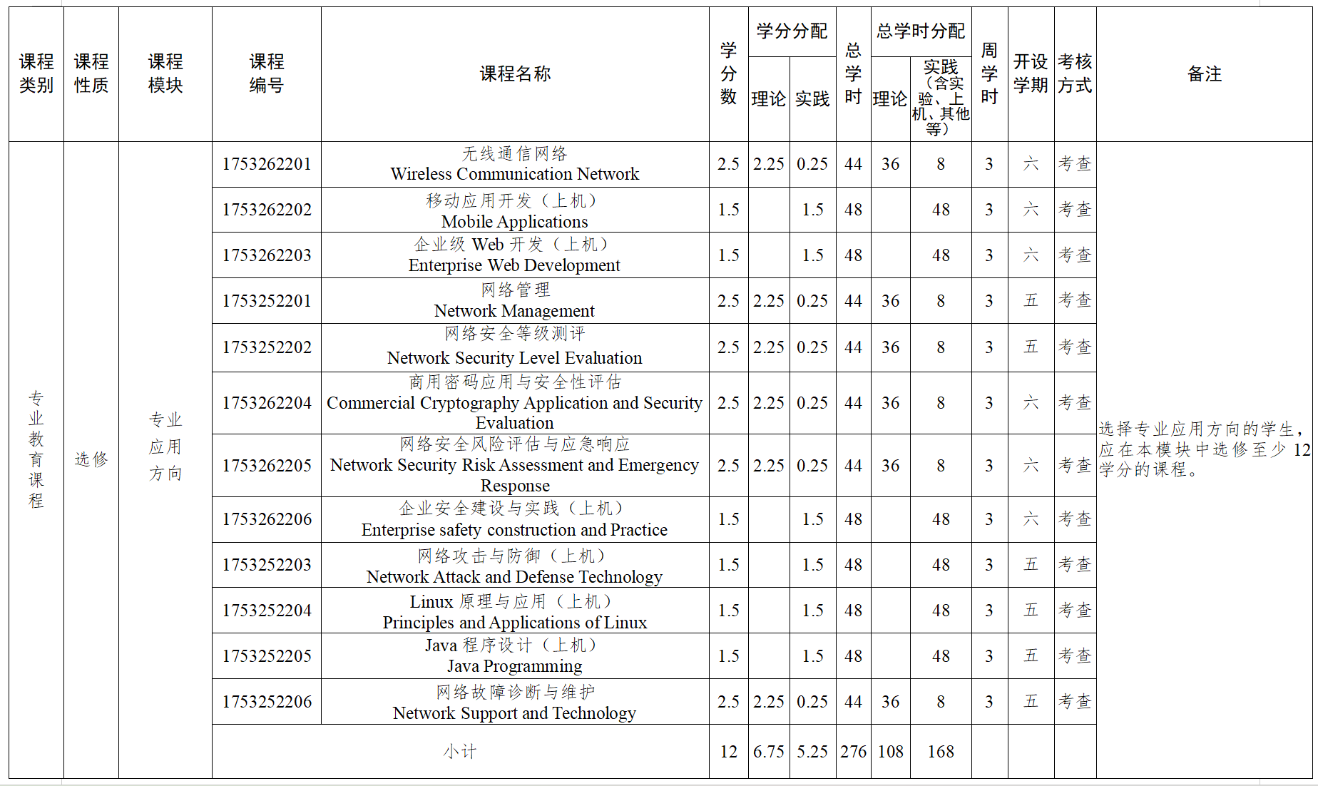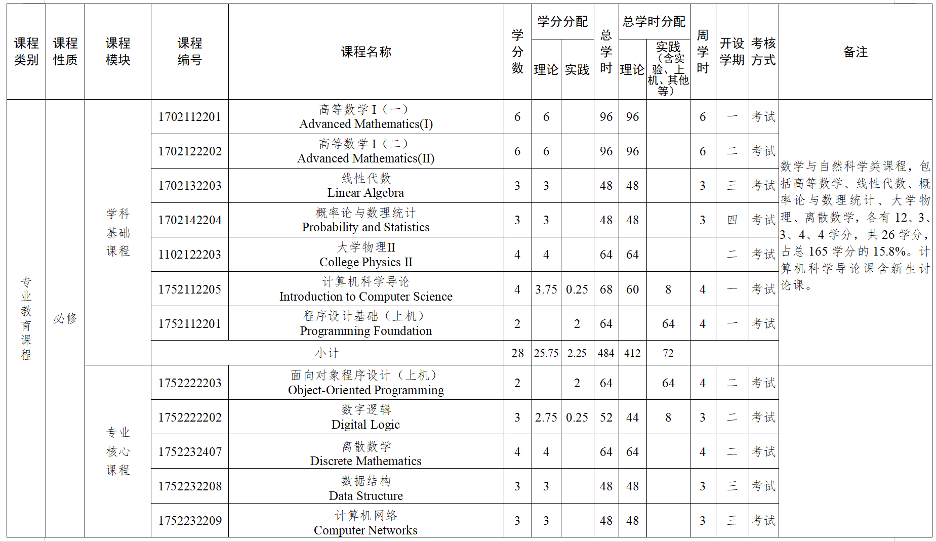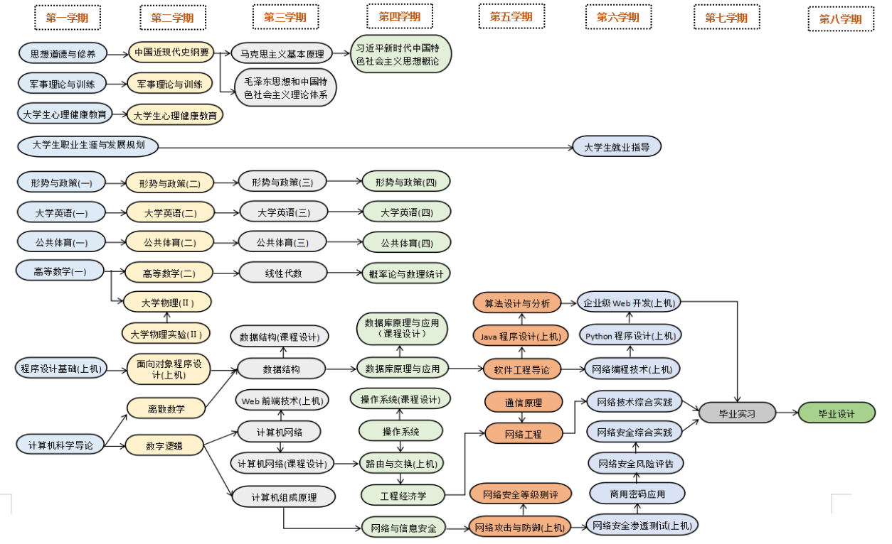 主要课程:高等数学、线性代数、概率论与数理统计、计算机科学导论、程序设计基础(上机)、大学物理、面向对象程序设计(上机)、数字逻辑、离散数学、计算机组成原理、路由与交换技术、数据结构、操作系统、数据库原理与应用、网络与信息安全、计算机网络、网络工程、通信原理、网络编程技术、工程经济学等。
