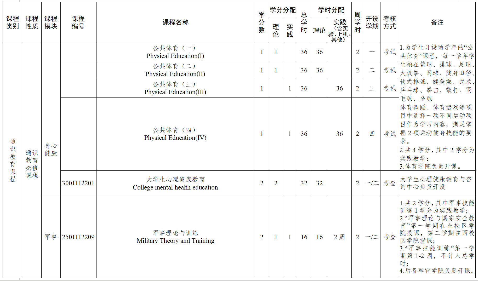表2 课程学时、学分及学期安排表