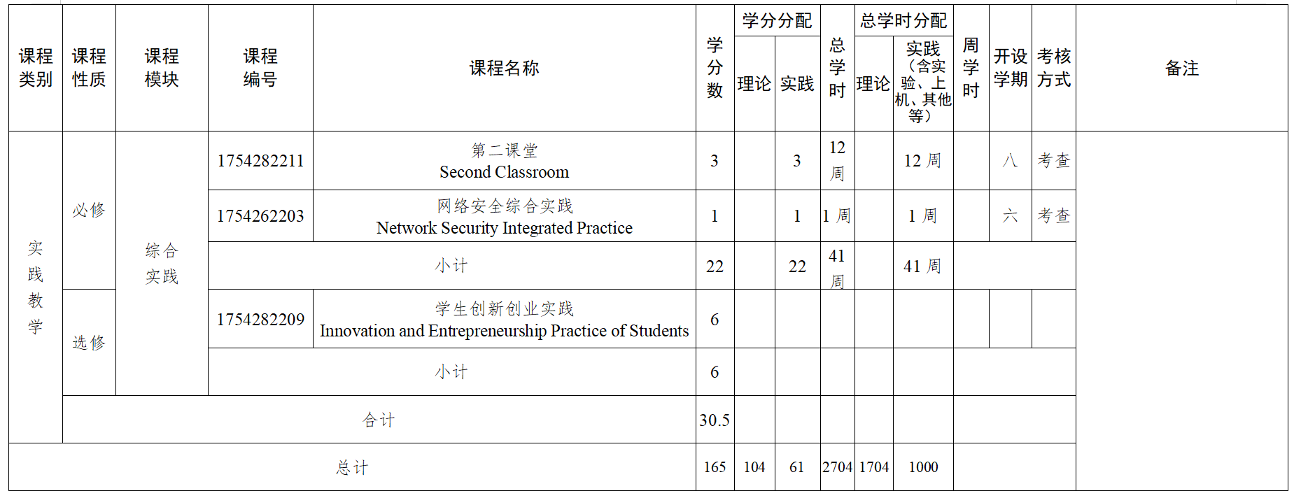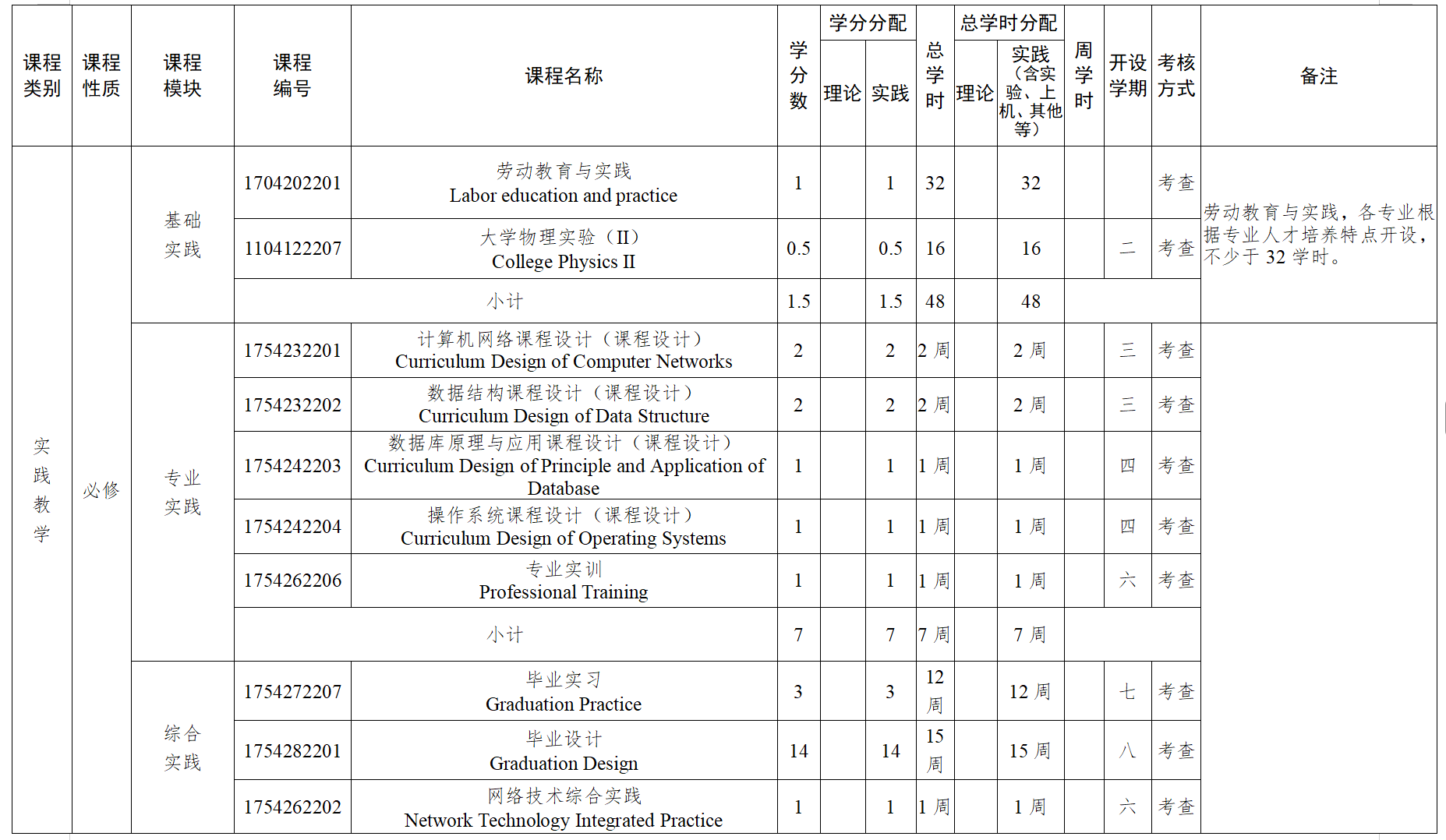 包括计算机科学导论、程序设计基础(上机)、大学物理、面向对象程序设计(上机)、数字逻辑、数据结构、计算机网络、操作系统、计算机组成原理、数据库原理与应用、路由与交换技术、软件工程导论、网络工程、通信原理、网络编程技术等专业课程的上机实践,以及劳动教育与实践、计算机网络课程设计、数据结构课程设计、操作系统课程设计、数据库原理与应用课程设计、网络技术综合实践、网络安全综合实践、专业实训、毕业实习、毕业设计、军事技能训练等。