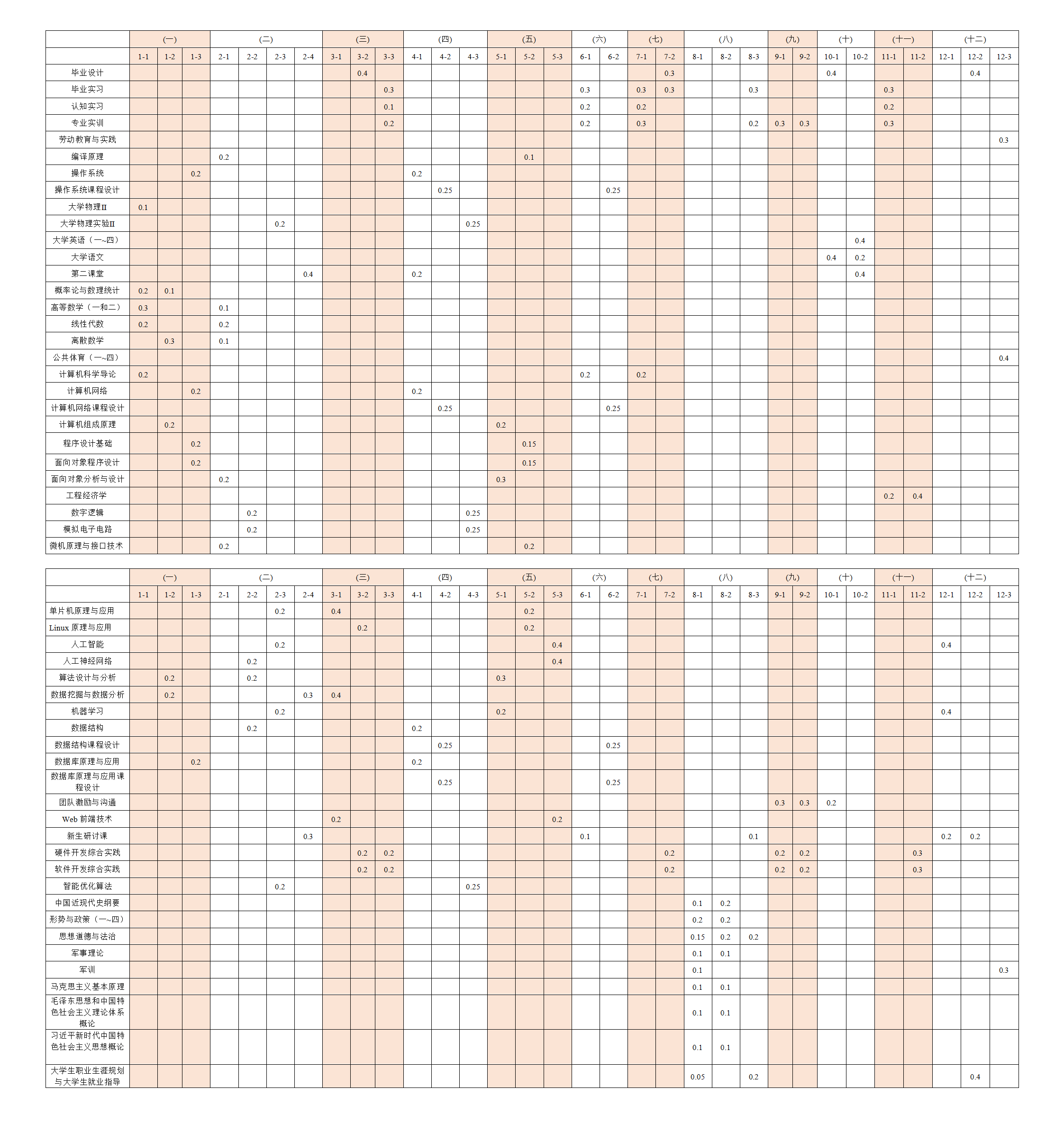 主要课程:高等数学、线性代数、概率论与数理统计、计算机科学导论、程序设计基础、大学物理、面向对象程序设计、新生研讨课、离散数学、计算机组成原理、模拟电子电路、数据结构、操作系统、数据库原理与应用、团队激励与沟通、数字逻辑、微机原理与接口技术、计算机网络、单片机原理及应用、嵌入式系统原理及应用、Python程序设计、机器学习、软件开发综合实践、硬件开发综合实践等。