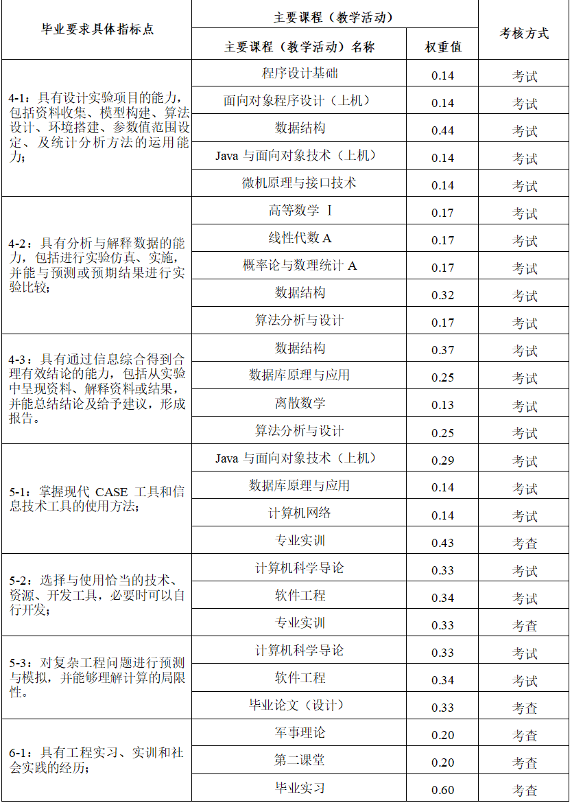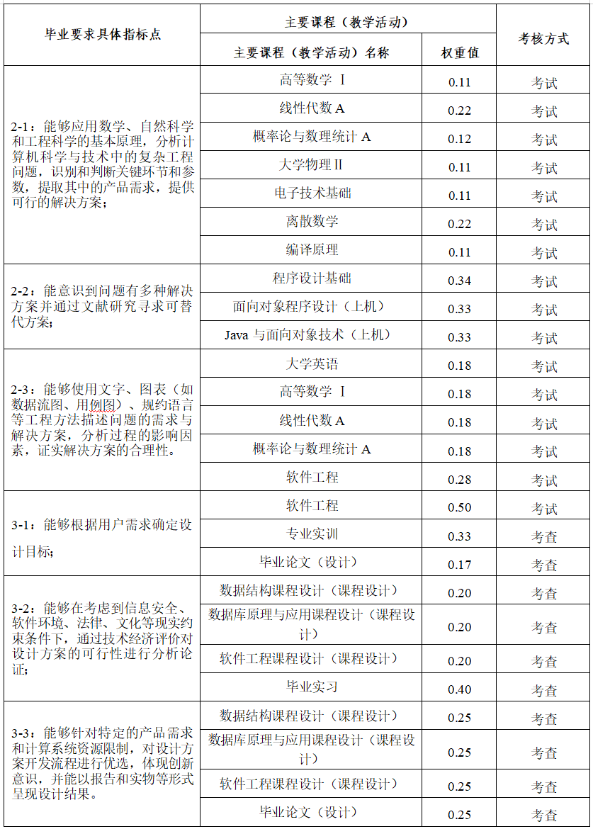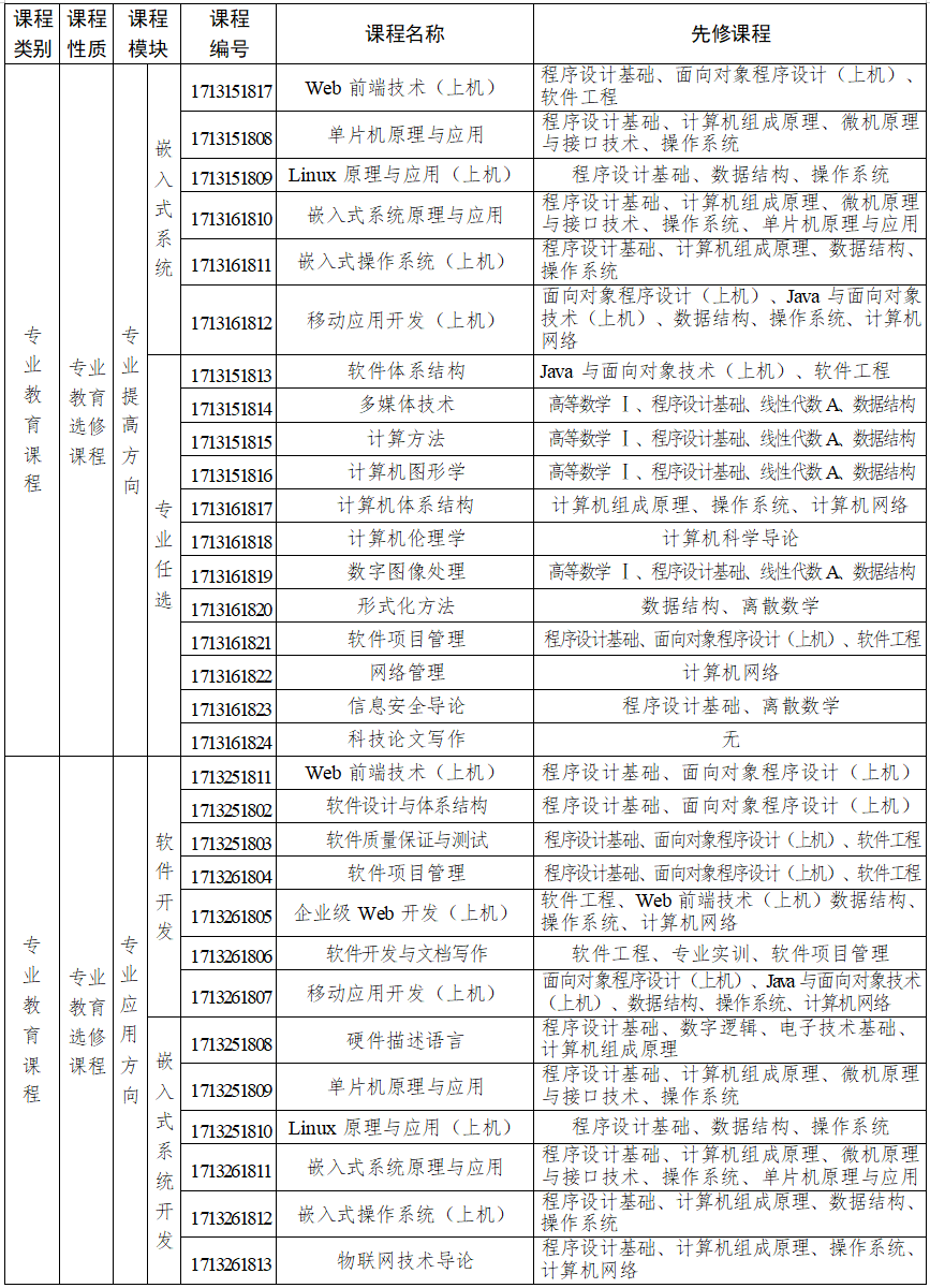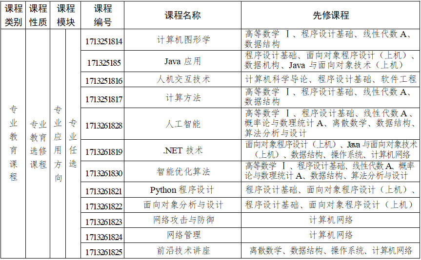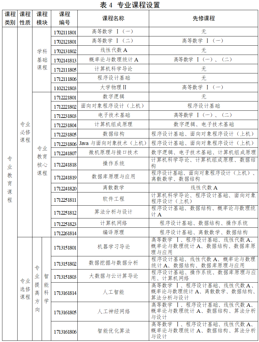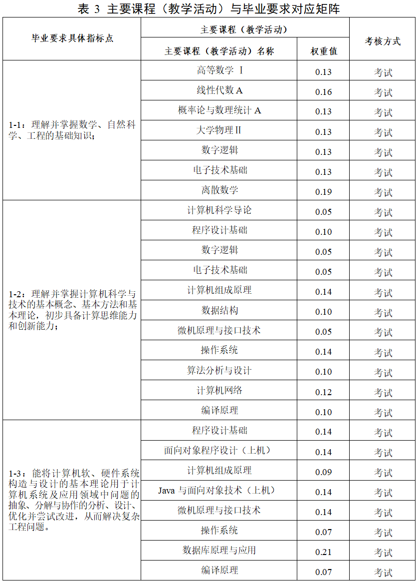 主要课程:高等数学、线性代数、概率论与数理统计、计算机科学导论、程序设计基础、数字逻辑、面向对象程序设计、电子技术基础、计算机组成原理、数据结构、Java 与面向对象技术、微机原理与接口技术、操作系统、离散数学、数据库原理与应用、计算机网络、软件工程、算法分析与设计、编译原理等。