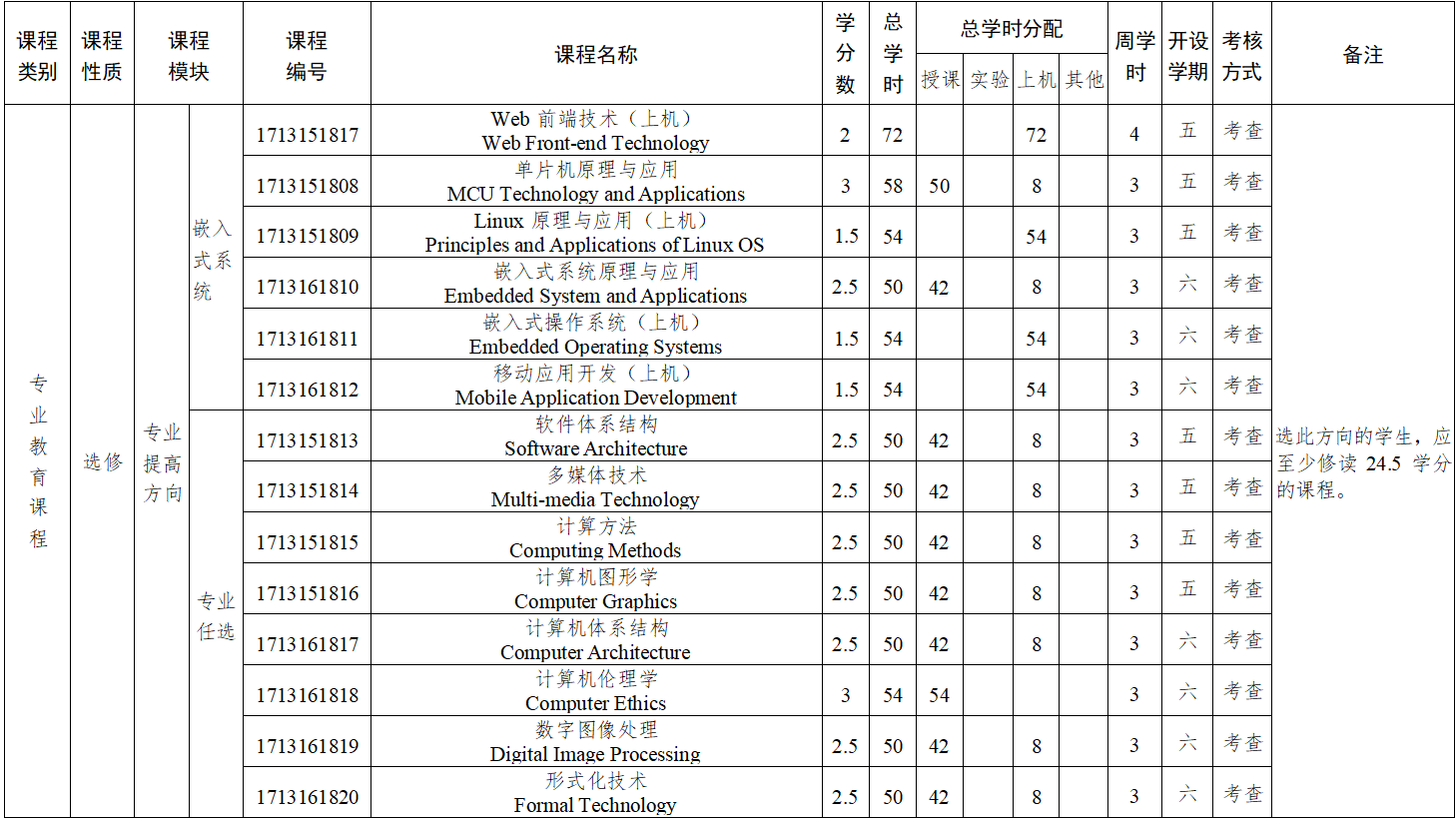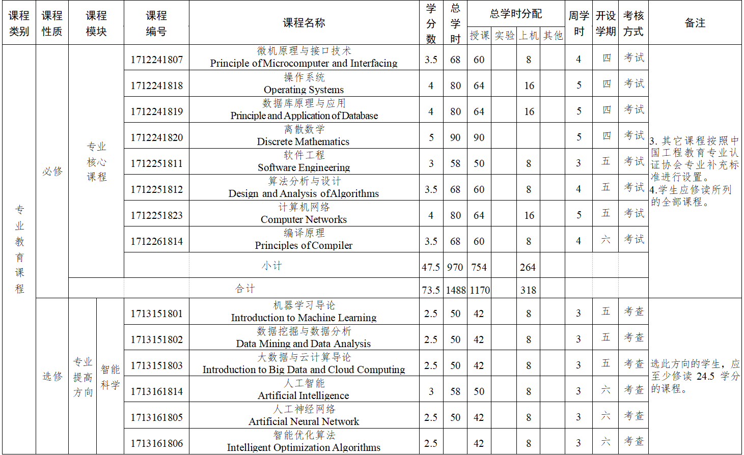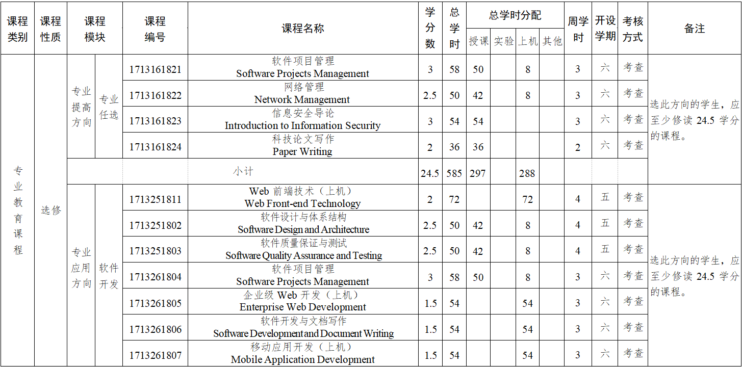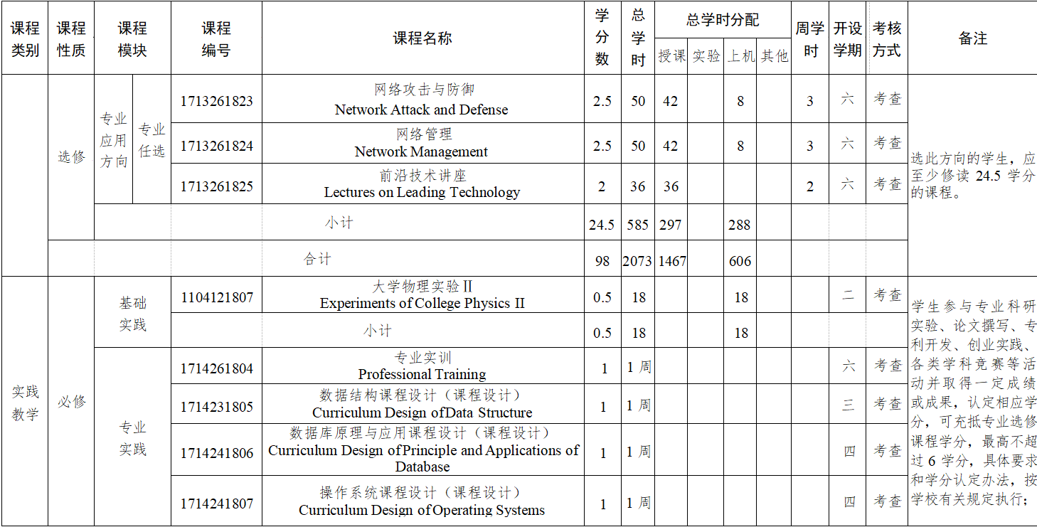 主要课程:高等数学、线性代数、概率论与数理统计、计算机科学导论、程序设计基础、数字逻辑、面向对象程序设计、电子技术基础、计算机组成原理、数据结构、Java 与面向对象技术、微机原理与接口技术、操作系统、离散数学、数据库原理与应用、计算机网络、软件工程、算法分析与设计、编译原理等。