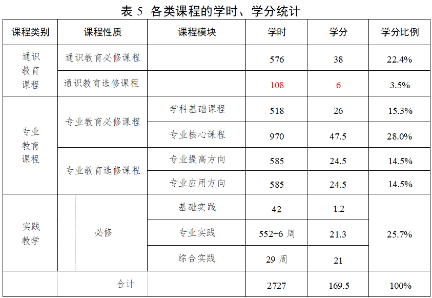 八、各类课程的学时、学分统计(见表 5)